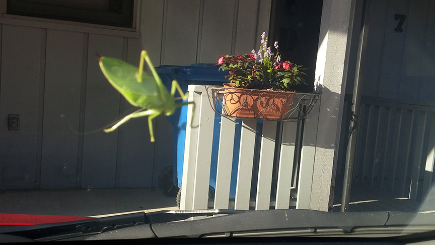 This little guy hung on for the six-mile ride, with speeds at times of 50 mph, only to give out shortly after we arrived home (well, my home). Now his body lies on my car window.