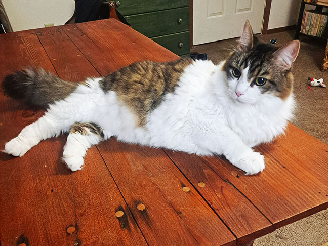 Some friends moved my table out of the storage room and into the living room, where it takes up a lot of space. However, Walter has adapted and enjoys sitting both on top of and below the table.